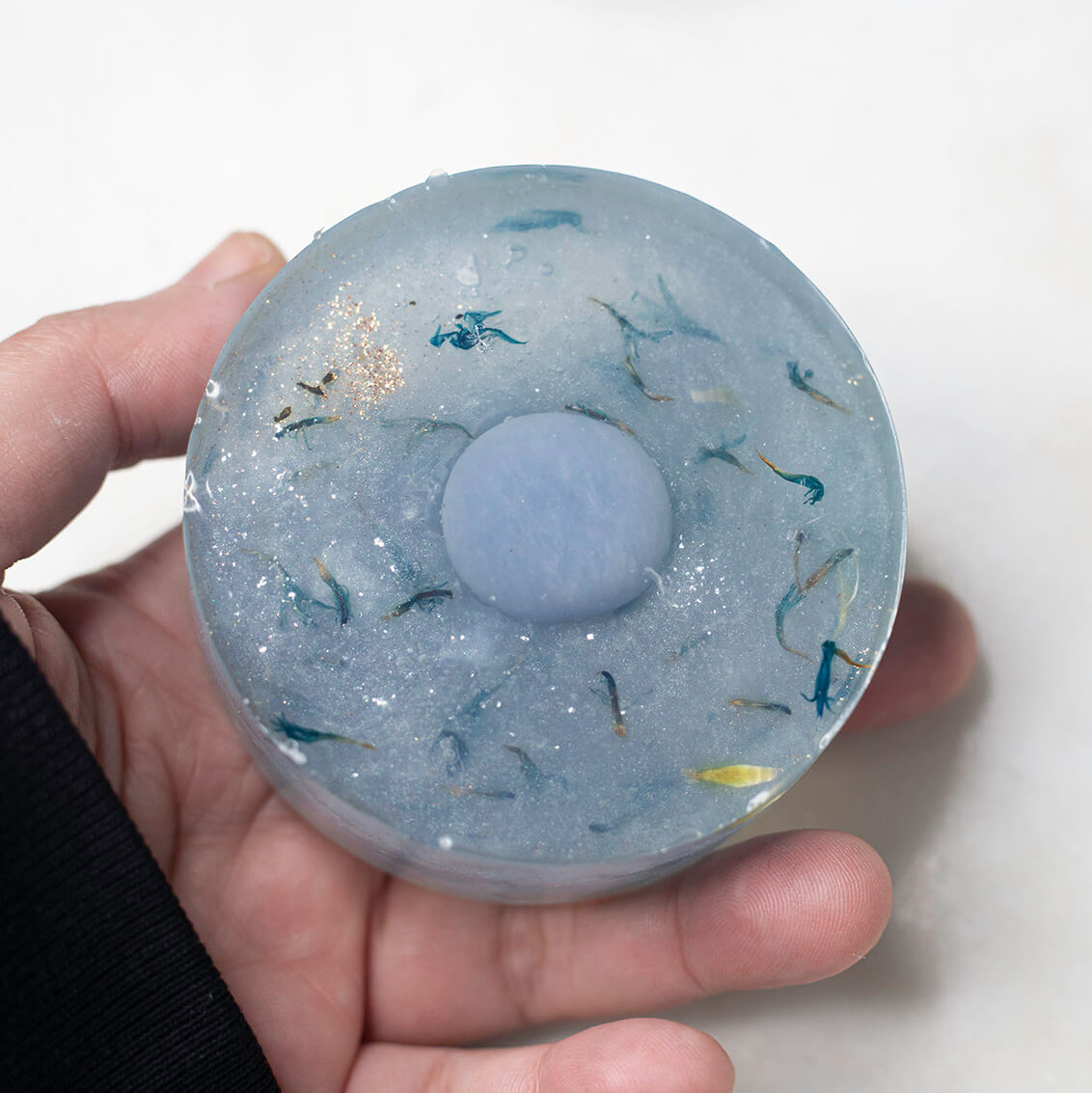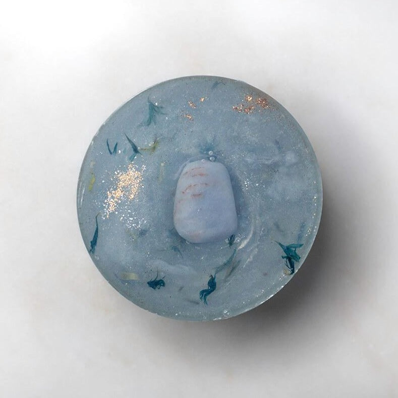 Embedded with Angelite, this bar improves spiritual awareness. It promotes self-expression while dispelling fear, anger and anxiety. Angelite is closely related to the astrological sign of Aquarius.Because of its blue color, angelite is associated with the throat, third eye and crown chakras. Allows for greater spiritual growth, enhanced intuition, and clearer communication. Encourages peace, promotes compassion.
