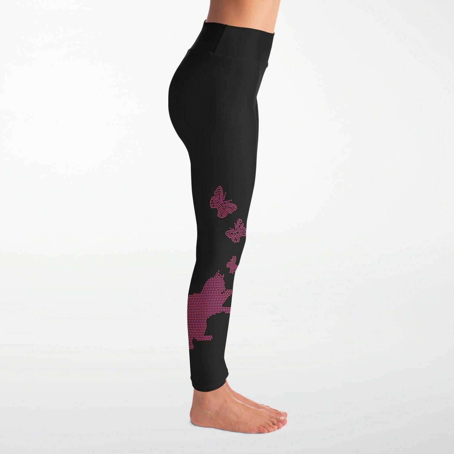 These leggings feature a pink kitty chasing butterflies on one side of the leggings. A large butterfly is featured on the front of the opposite leg. Perfect bling for the any time. The material is super soft made of 92% polyester 8% Spandex.