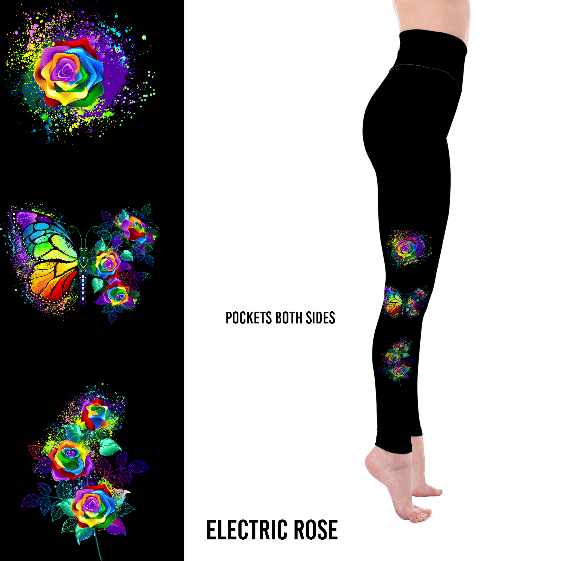Make a bold, artistic statement with these Rainbow Rose & Butterfly Leggings. Set on a sleek black background, the design features vivid, paint-splashed rainbow roses paired with a radiant butterfly for a striking blend of color and motion. Each element pops with neon-inspired hues, creating a luminous, gallery-worthy look that’s both expressive and elegant.