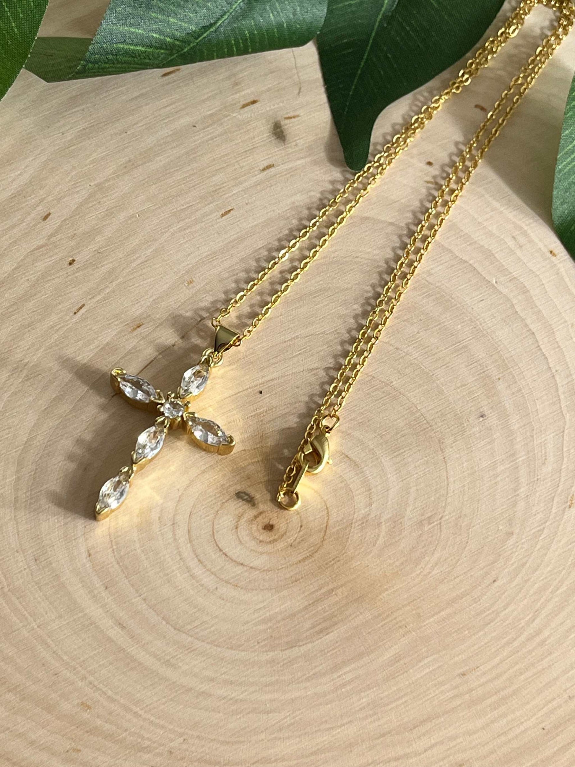 This elegant piece features a durable 16K gold chain paired with an 18K gold-filled crystal cross pendant. Designed with quality in mind, it is hypoallergenic, anti-tarnish, and crafted to last. The 18-inch chain has a simple lobster clasp closure for a secure and comfortable fit.