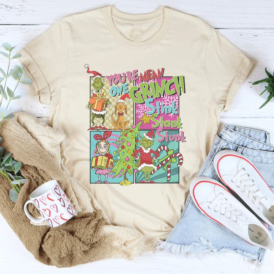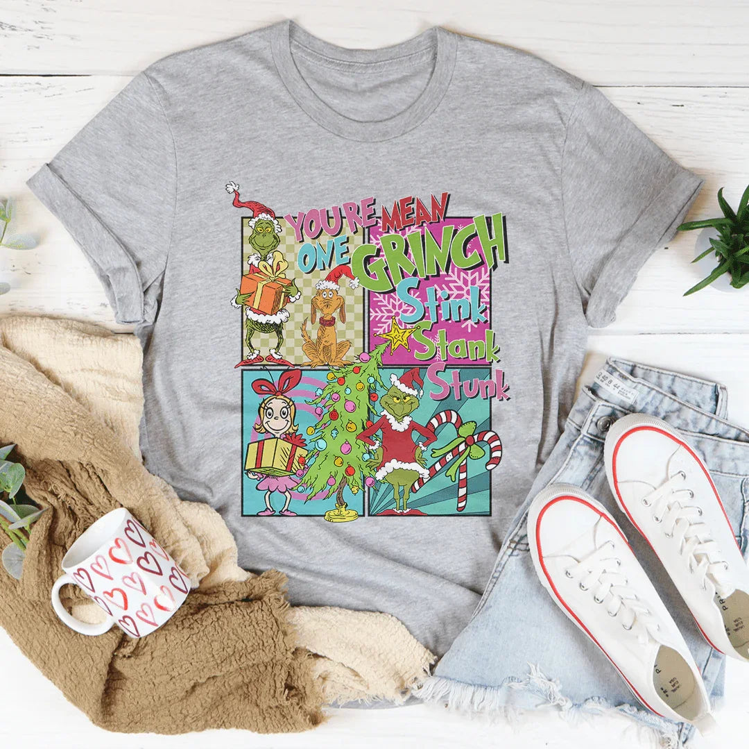 Get ready to channel your inner Whoville spirit with our "You're A Mean One, Grinch - Stink, Stank, Stunk, Cindy Lou Who" t-shirt. This playful tee is drenched in nostalgia, celebrating the beloved classic that has captivated hearts every holiday season. Perfect for Christmas parties, casual holiday shopping, or cozy movie nights.