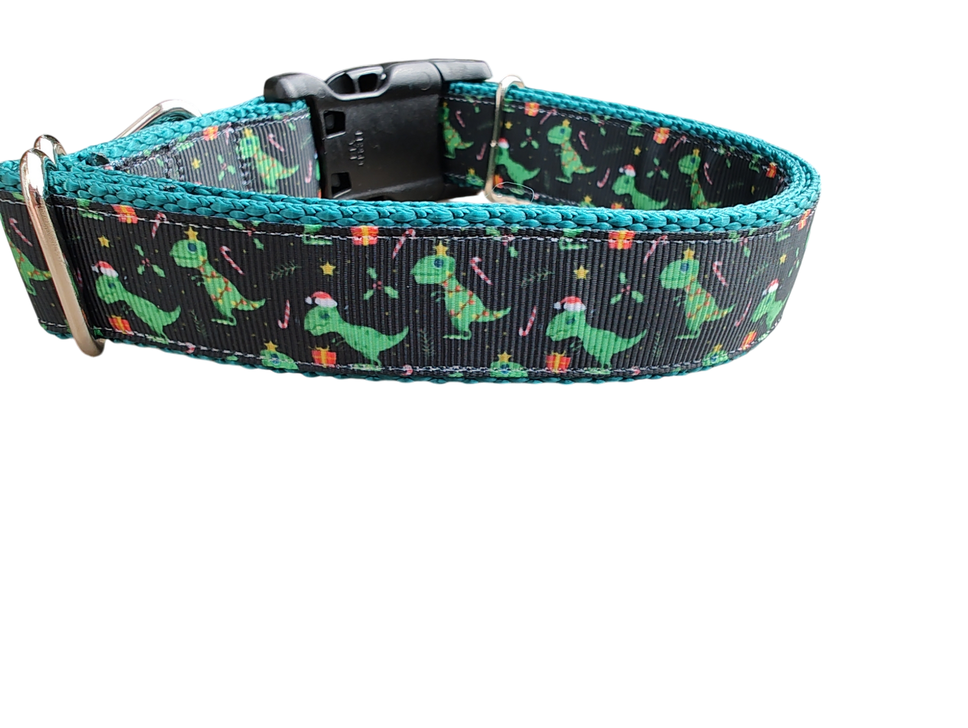 Christmas T Rex dog collar on nylon webbing