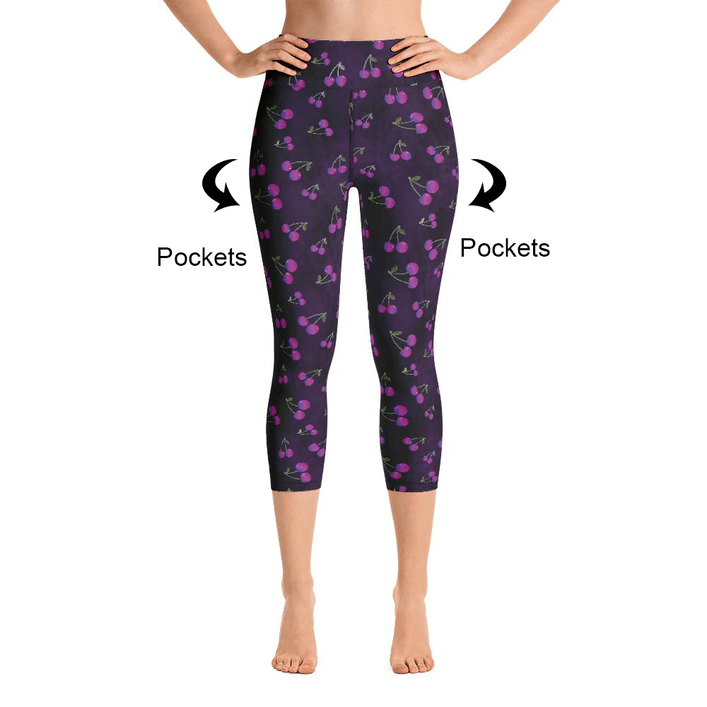 These leggings feature large cherries that with combination of pink and purple on a black background. They feature a vivid all-over design on and a high waistband for lasting comfort.
