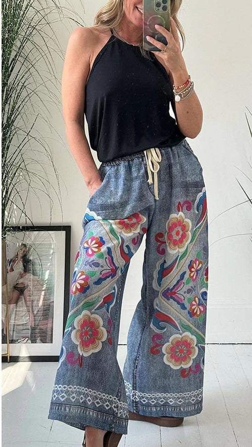 Elevate your style with our Faux Denim boho wide leg pants! Made with 100% polyester, these pants offer a comfortable fit while providing a unique faux denim look. The boho style and floral design adds a touch of femininity to any outfit. Whether it's spring, summer, or fall, these wide leg pants are the perfect addition to your wardrobe.