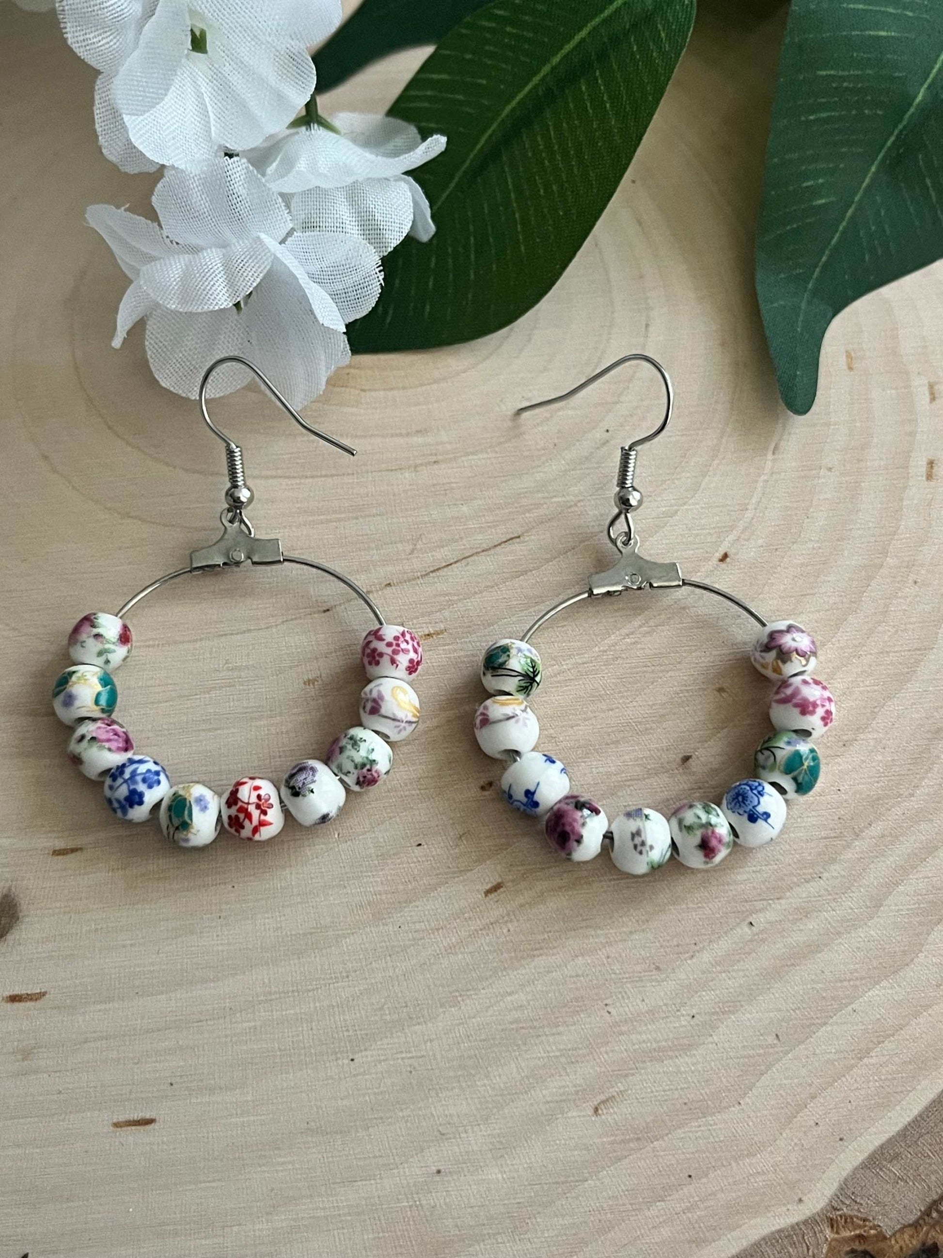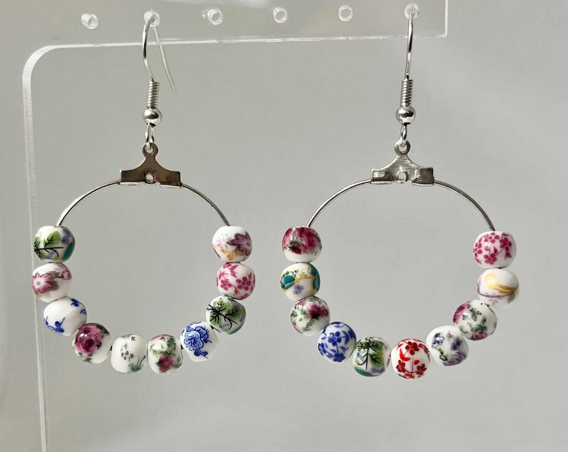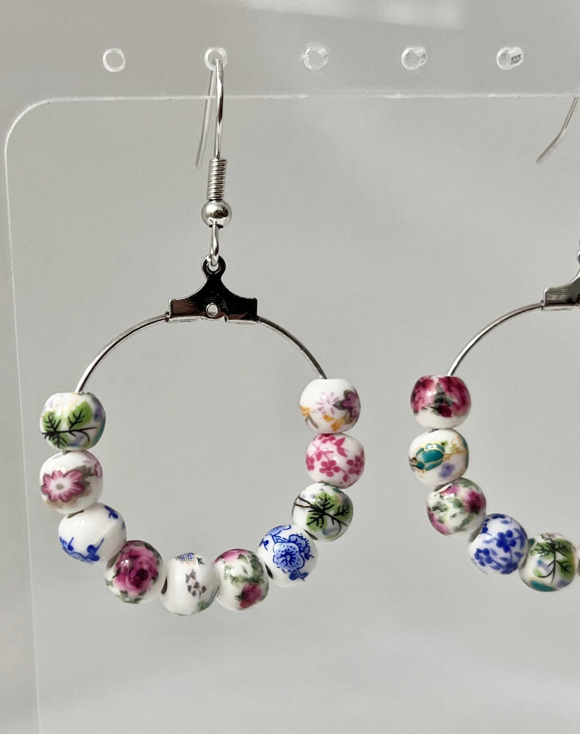 Floral Hoop Earrings – Multicolored Beaded Silver Jewelry