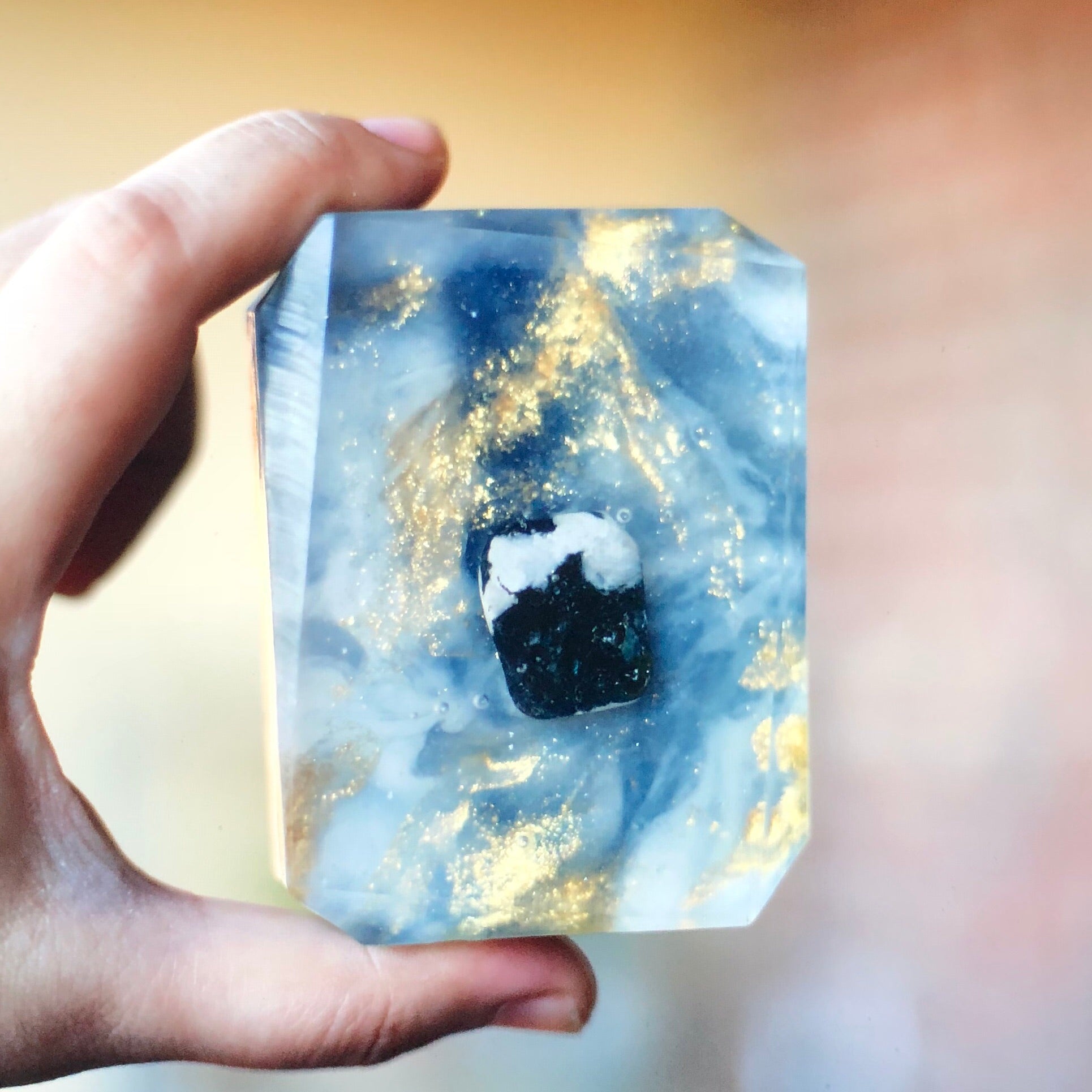 Made with Activated Charcoal, Kaolin Clay, Shea butter and lots of sparkly glitter (biodegradeable). This bar is scented with the lavish blend orange, peach, cherry blossoms and white jasmine.