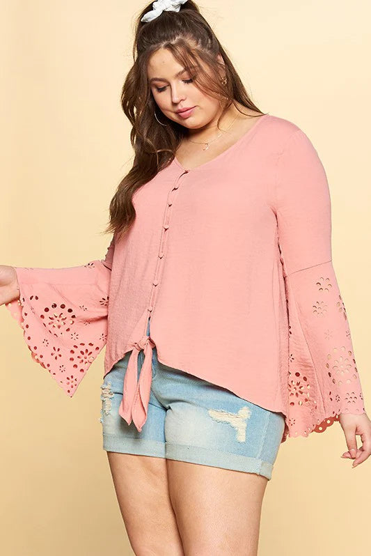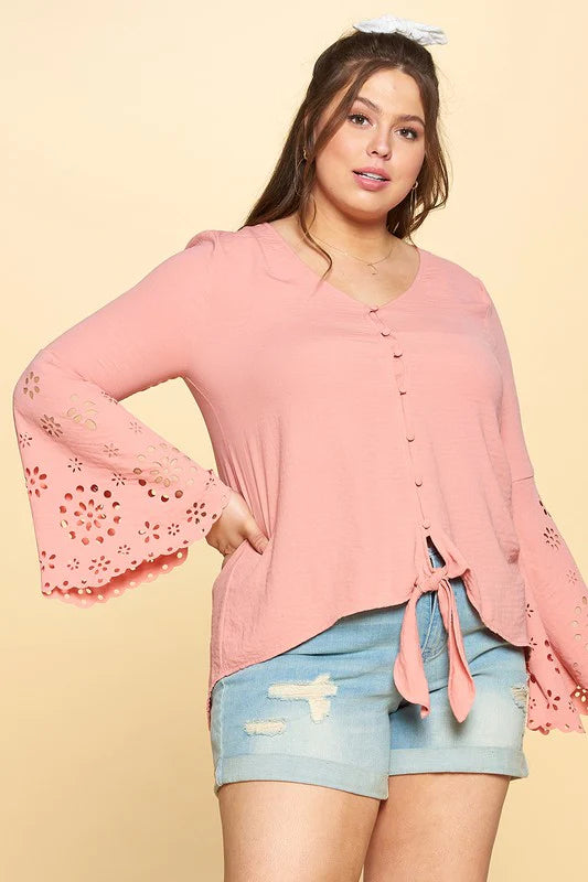 MAUVE SOLID BUTTON FLORAL CUTOUT SLEEVE TIE HEM TOP