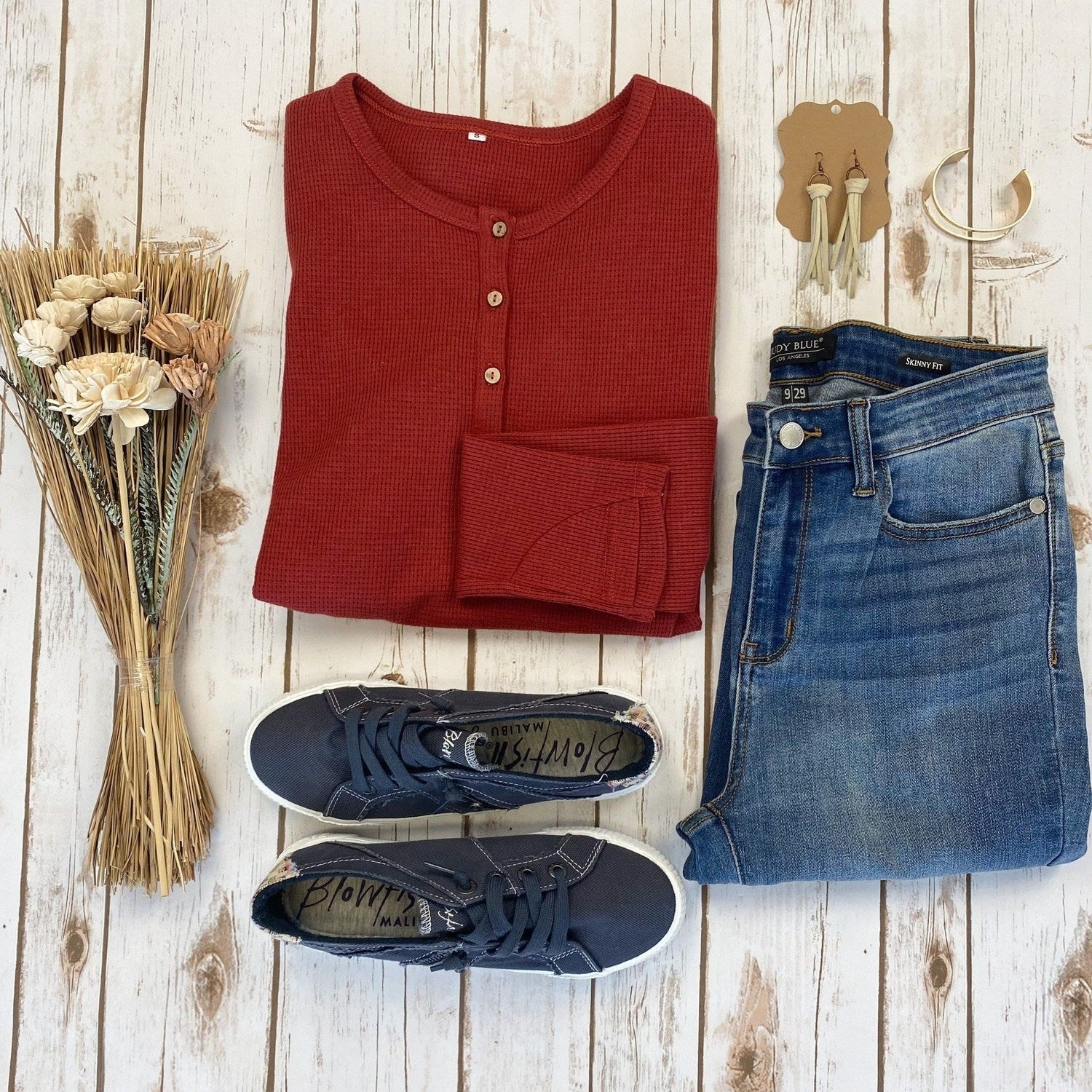 Rust Henley Shirt Women Long Sleeve with Thumb Holes